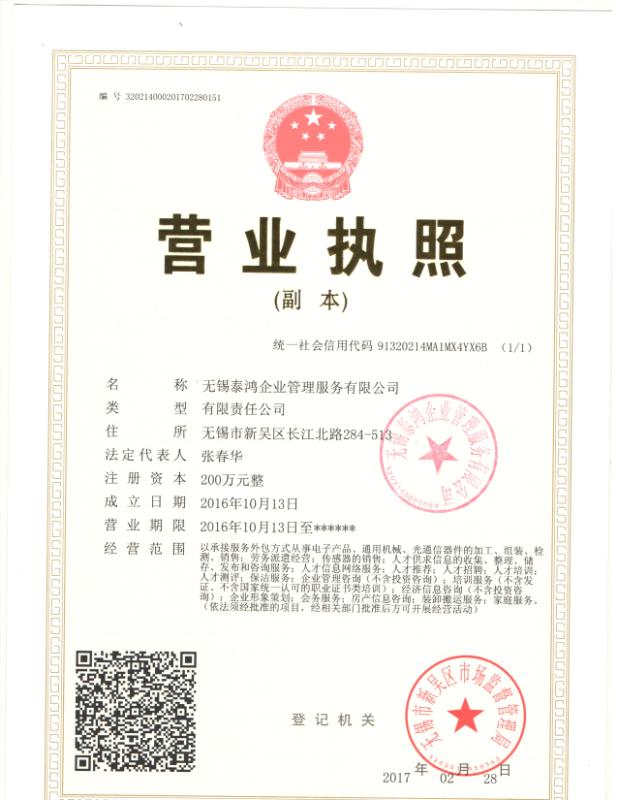 无锡泰鸿企业管理服务有限公司成立