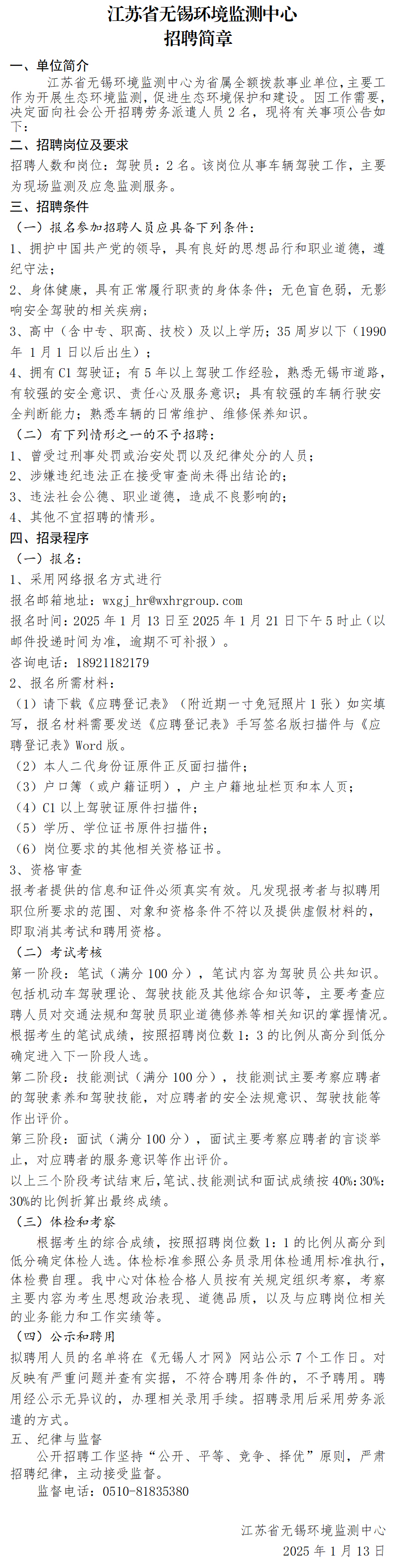 【招聘信息】 江苏省无锡环境监测中心招聘简章